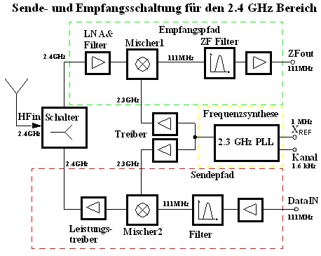 Bild 1 zeigt eine typische Anwendung für die Frequenzsynthese im 2.4 GHz Bereich. Die im Bereich von 2.289 GHz bis 2.369 GHz arbeitende PLL Schaltung ist das zentrale Element einer solchen Sende und Empfangsschaltung.